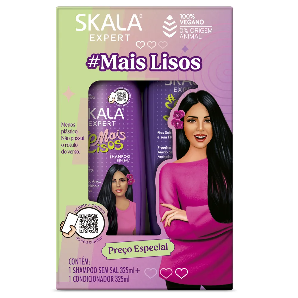 Kit vegano que ajuda a alinhar os fios, reduzir o frizz e deixar o cabelo mais liso.